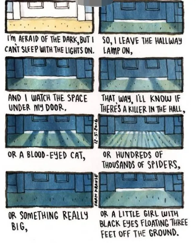 2.我怕黑,开灯又睡不着,只能开着走廊的灯,我会盯着门缝,这样当杀手到来就能知道了,或者还有那些眼睛血红的猫,成千上万蜘蛛,大怪兽,没有眼白悬浮在半空的小女孩等。。