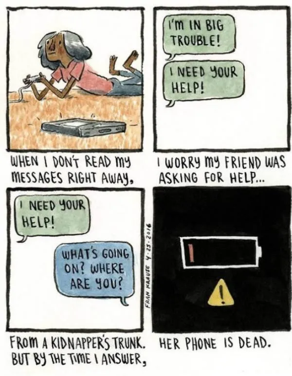 3.每次有新讯息来不及读,我都担心那是朋友陷入困境在求救,她可能被困在绑匪的卡车里,但当我回复,她手机正好没电。