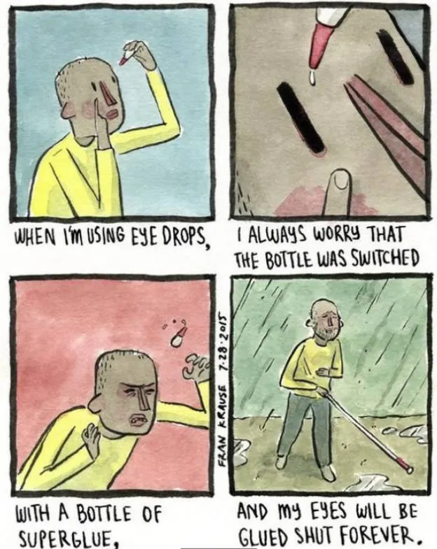 4.每次用眼药水,我都担心有人换成了强力胶,那样我的眼睛就再也睁不开了。