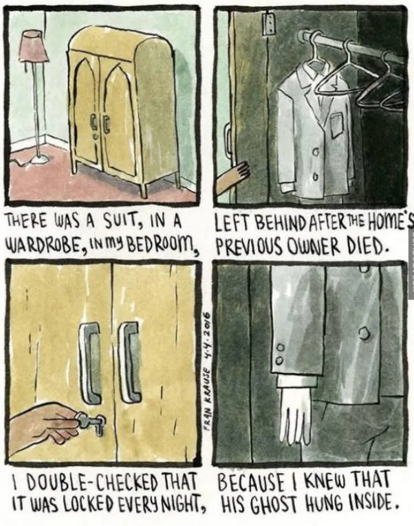 10.我卧室的衣柜里有一套西装,这是前任房主死后留下了的,每晚睡前我都会反复检查衣柜的锁,因为我知道那人的灵魂就挂在里面。