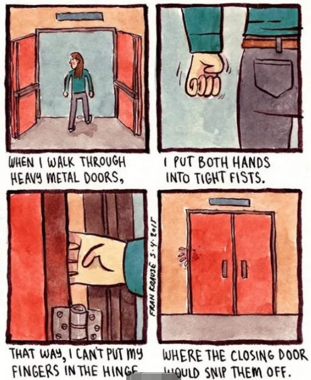 11.每次穿过厚重的大门时,我都会缩起手指,这样我就不可能将手指放进门缝,关门时它们也不会被夹断。
