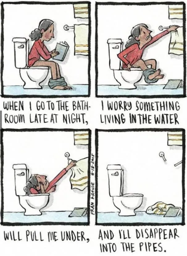 13.晚上去上厕所时,我很担心水里会有怪物把我拖进去,让我就这样消失在下水管道里。