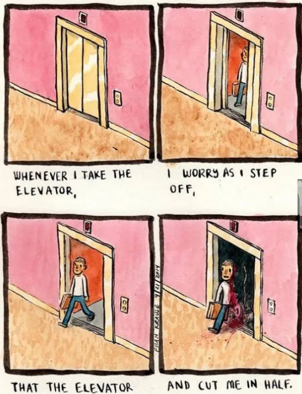 15.每次搭乘电梯,我都担心出门时电梯突然掉下去,这样我就被切成两半了。。