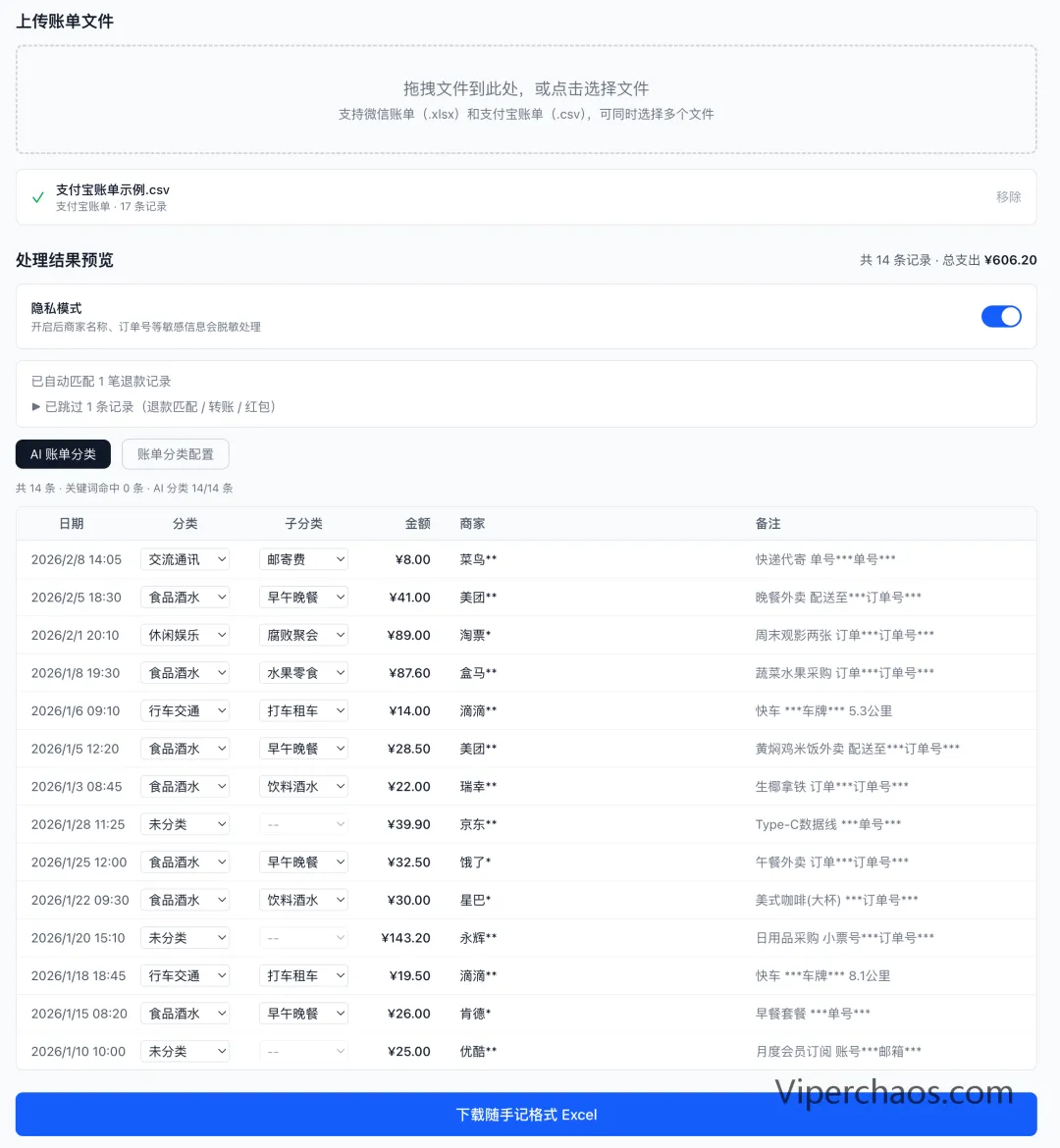 账单数据涉及隐私,这一点得说清楚。上传的账单文件只在浏览器里处理,不经过任何服务器。导入随手记的数据也是经过脱敏的——商家名称会被部分遮盖,备注里的手机号、订单号、车牌等敏感信息在本地处理,不走大模型 API。