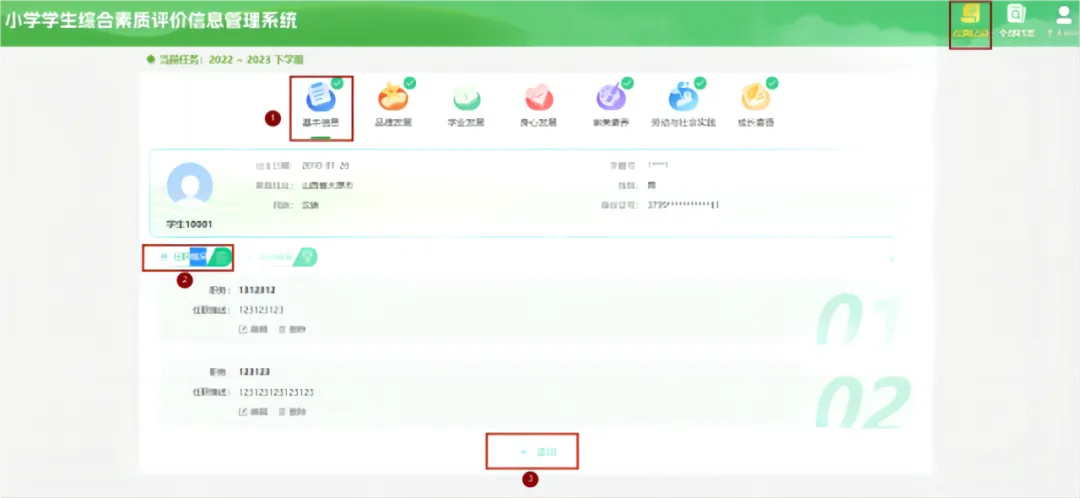 小学学生综合素质评价信息管理系统有基本情况、品德发展、学业发展、身心发展、审美素养、劳动与实践、成长寄语七大模块。