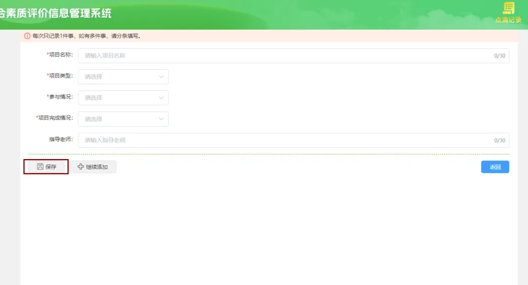输入项目名称,选择项目类型、参与情况、项目完成情况、指导教师,指导老师有的话,点击保存。