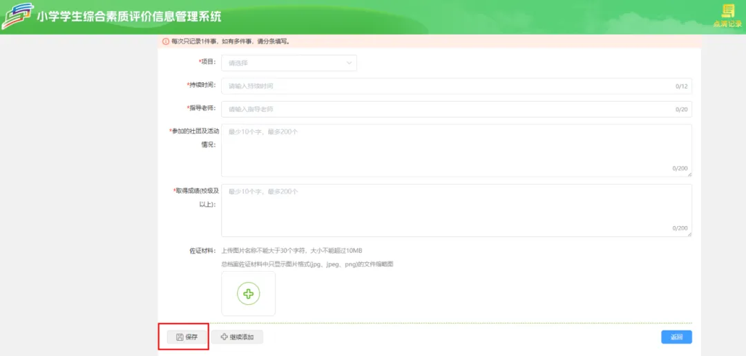 学生进入系统后点击【点滴记录】–>【学业发展】->【综合性学习情况】可添加学生的日常各门课程知识与技能的掌握情况、课堂表现、自主学习意识和能力、阅读习惯,参加学校拓展课程、社团活动,小制作、小发明科学兴趣特长等情况。