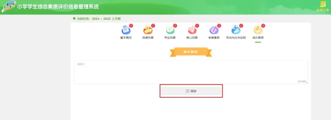 学生家长点击【成长寄语】编辑填入后保存。