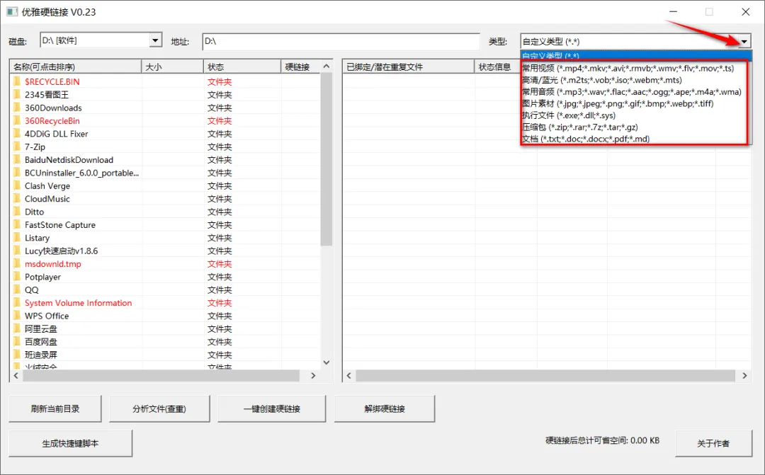 右上角可以选择文件类型,包括视频、音频、图片、文档和压缩包等,默认不选就是查找全部类型。
