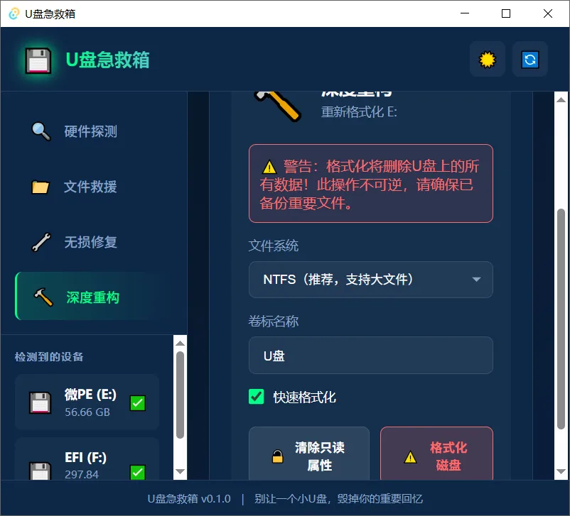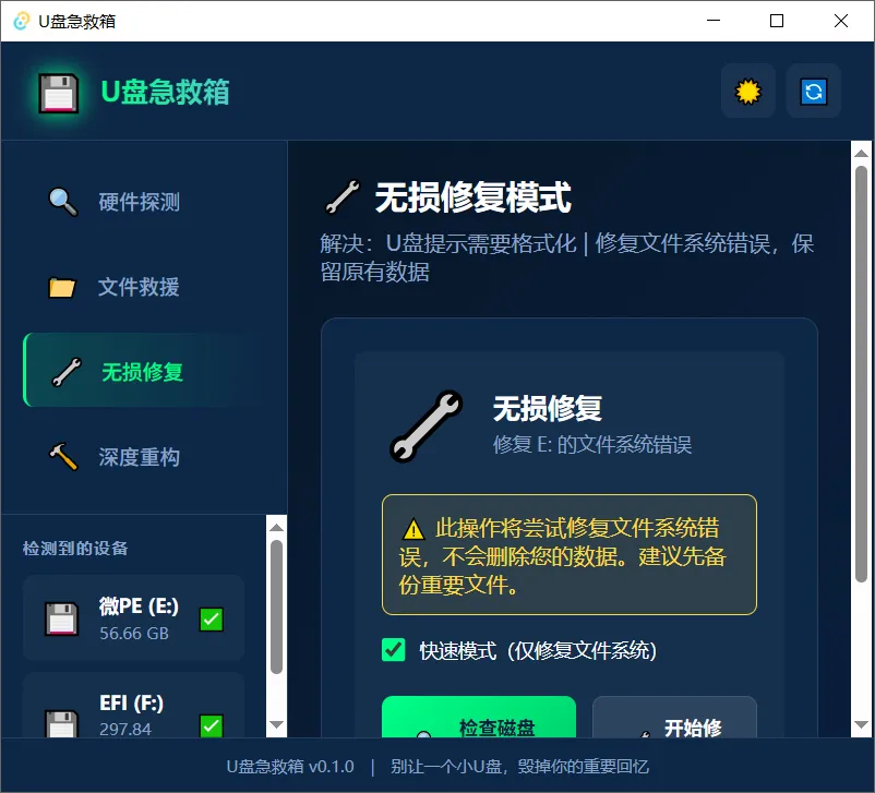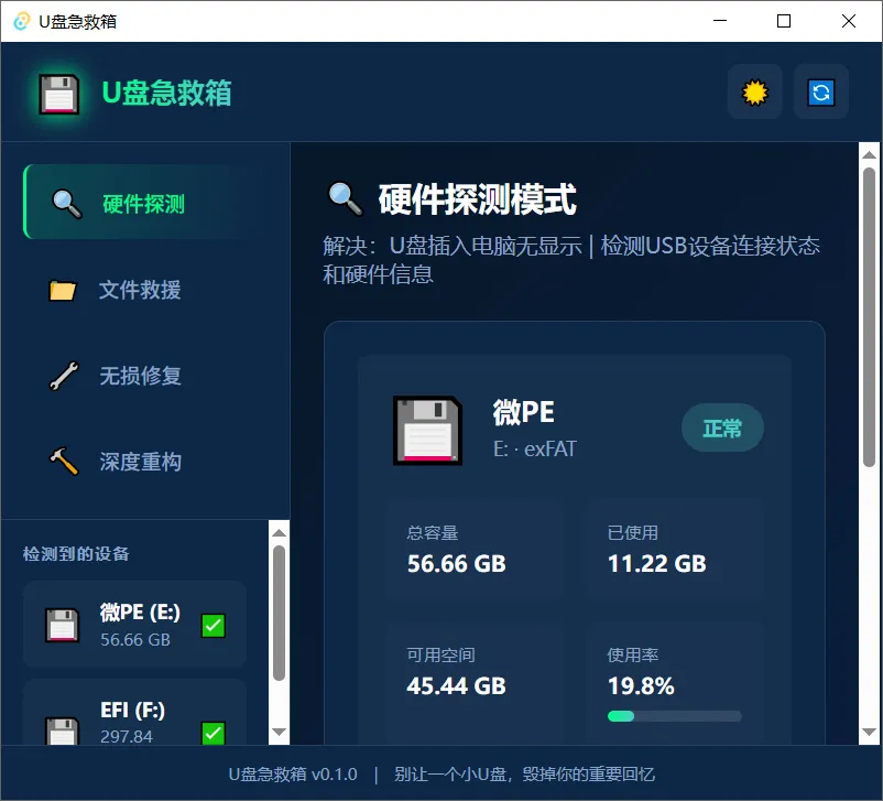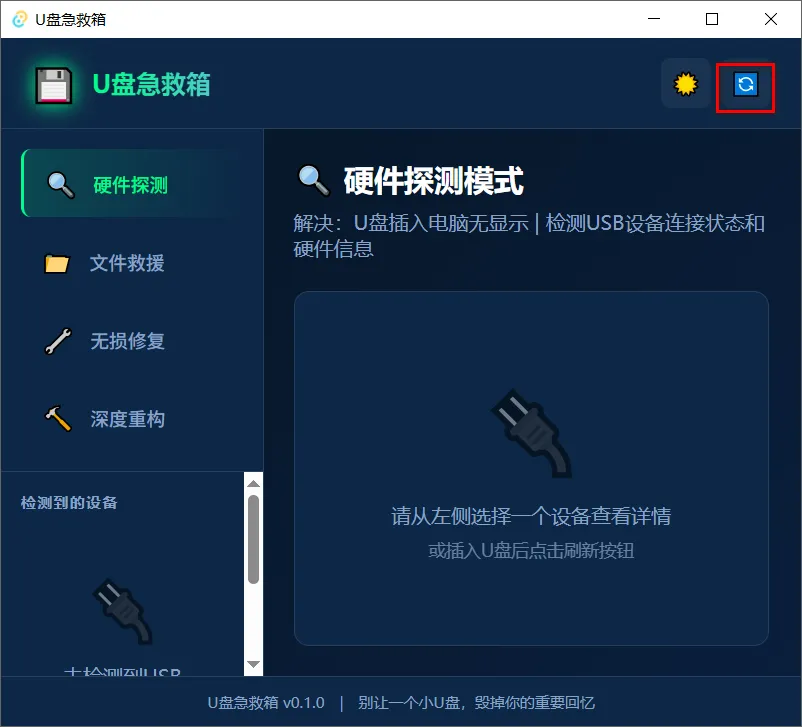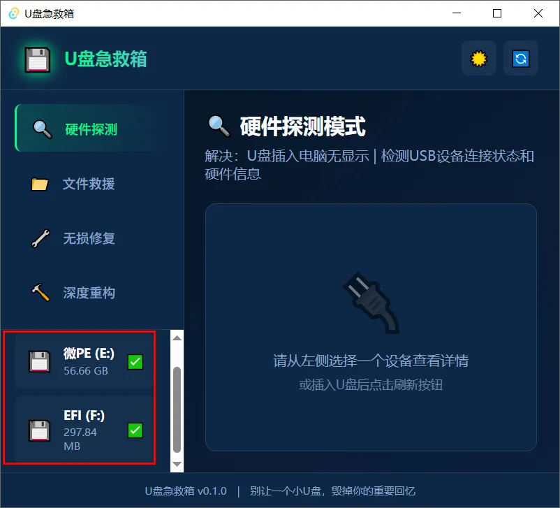 插入U盘后,在左下角选择U盘,如果看不到U盘就点击右上角刷新试试,支持硬件检测、文件救援、无损修复和深度重构功能。