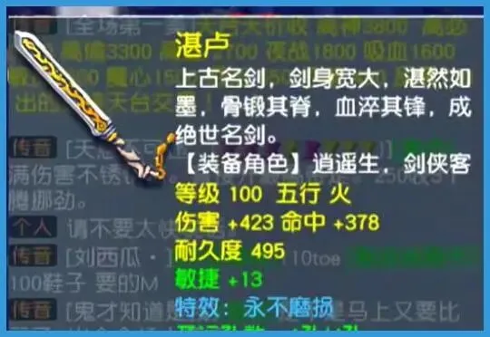 压轴登场的是100级剑,可以说是在畅玩服近期最有分量的非磨一员。再来看一下主要的数据部分:伤害提升423点、命中增加378点、敏捷加成增加了13点,并且特效永不磨损。最重要的一环就是初伤为四百二十三了,已经接近专用武器的最大值了,虽然爆发力不算很强,但是综合总输出能力依然很优秀,在十级九的任务环境中可以算得上是高效的打脸手。再加上13敏捷之后大唐这种需要抢节奏、控制出手顺序的物理系就会感觉明显地提升体感。