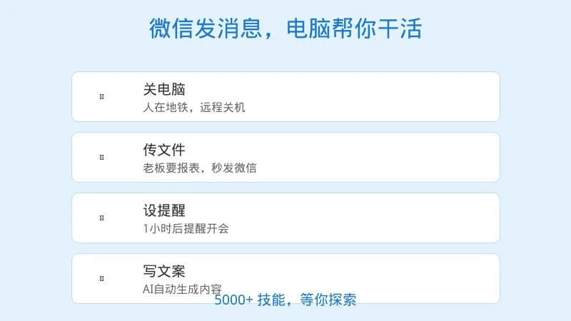不是那种需要记IP地址的远程桌面软件,也不是要配置端口映射的专业工具。而是——打开微信,发条消息,你的电脑就开始干活了。