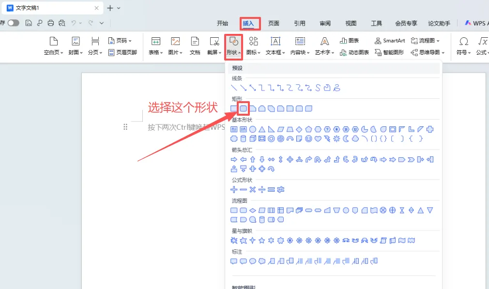 1、在空白文档上点击“插入 > 形状”,选择带圆角的矩形。