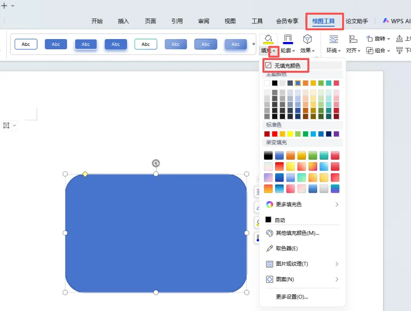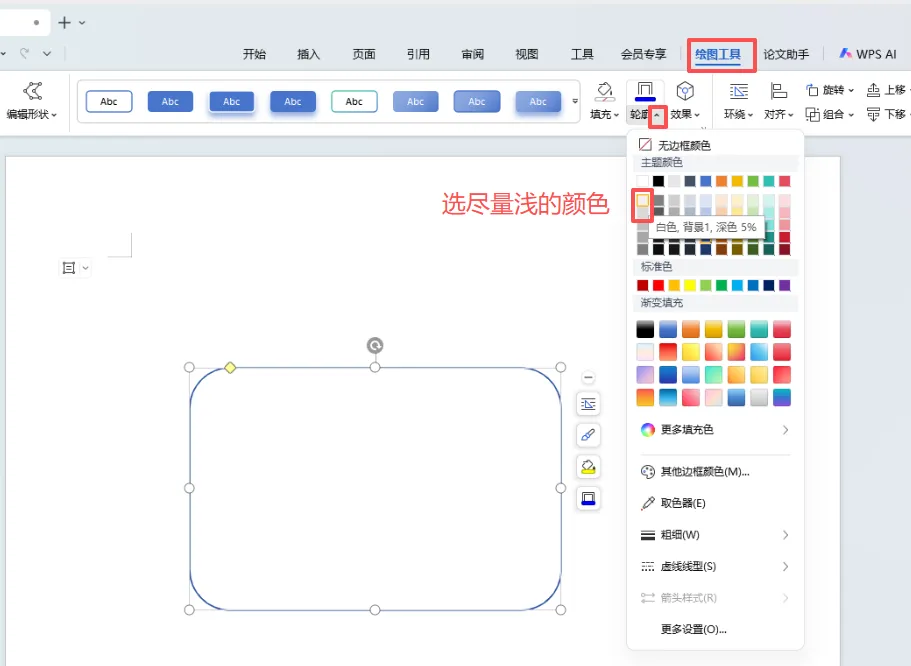 3、在圆角矩形选中的状态下,分别点击“绘图工具”下的“填充”和“轮廓”修改圆角矩形的填充色为无颜色,轮廓色为浅灰色。
