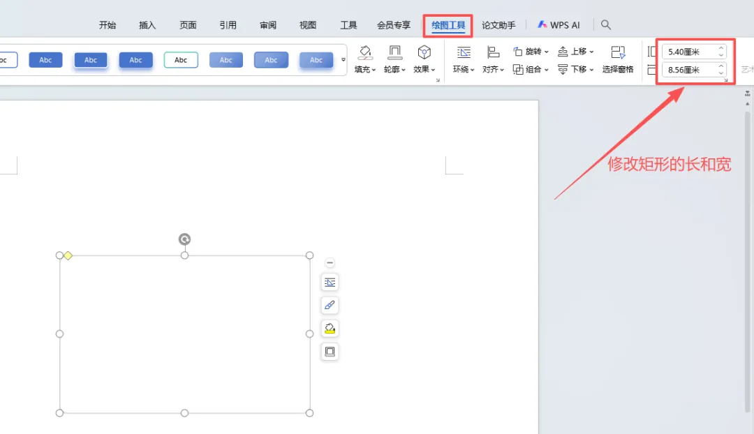 5、在圆角矩形被选中的状态下,在“绘图工具”的长宽中输入值,调整矩形框的大小,使矩形框与身份证大小一致。(身份证的长为8.56厘米,宽为5.4厘米)