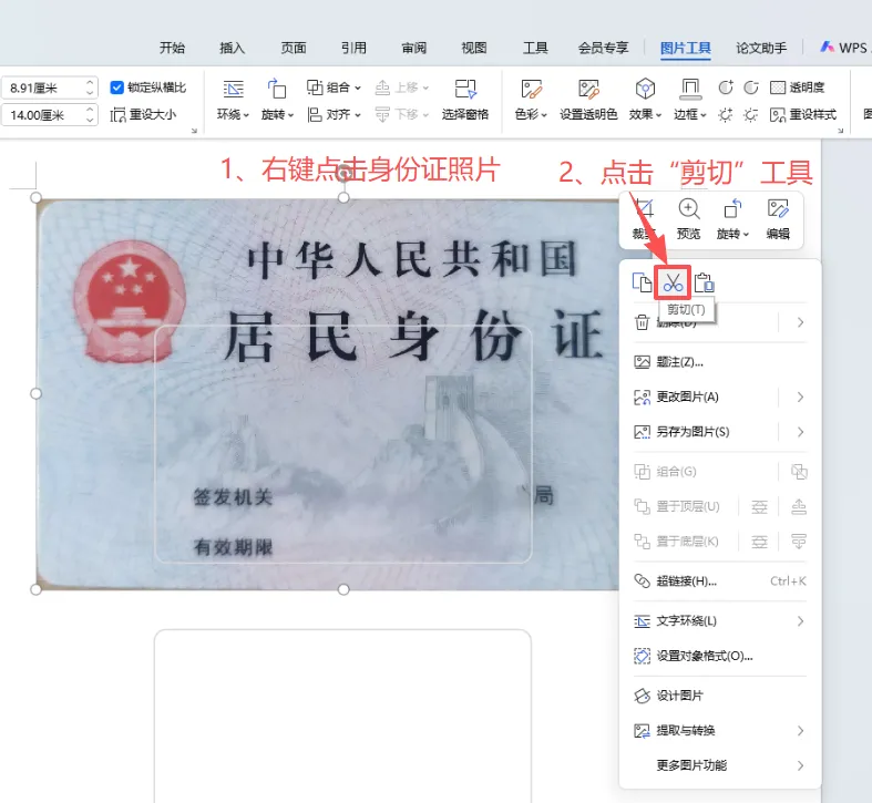 9、右键点击身份证照片,在显示的快捷菜单中点击“剪切”工具。