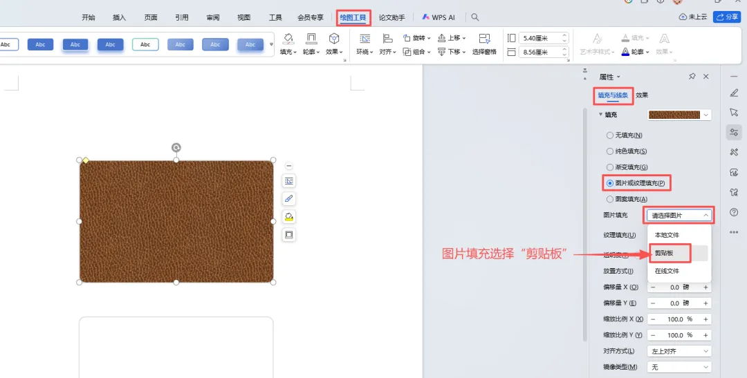 10、双击之前画好的两个圆角矩形中的其中一个的边框,在选中该圆角矩形的同时,在界面右侧打开矩形的“属性”菜单,在“填充与线条”下的“填充”部分选择“图片与纹理填充”,再点击“图片填充”后的“请选择图片”,在显示的三个选项中点击“剪切板”。