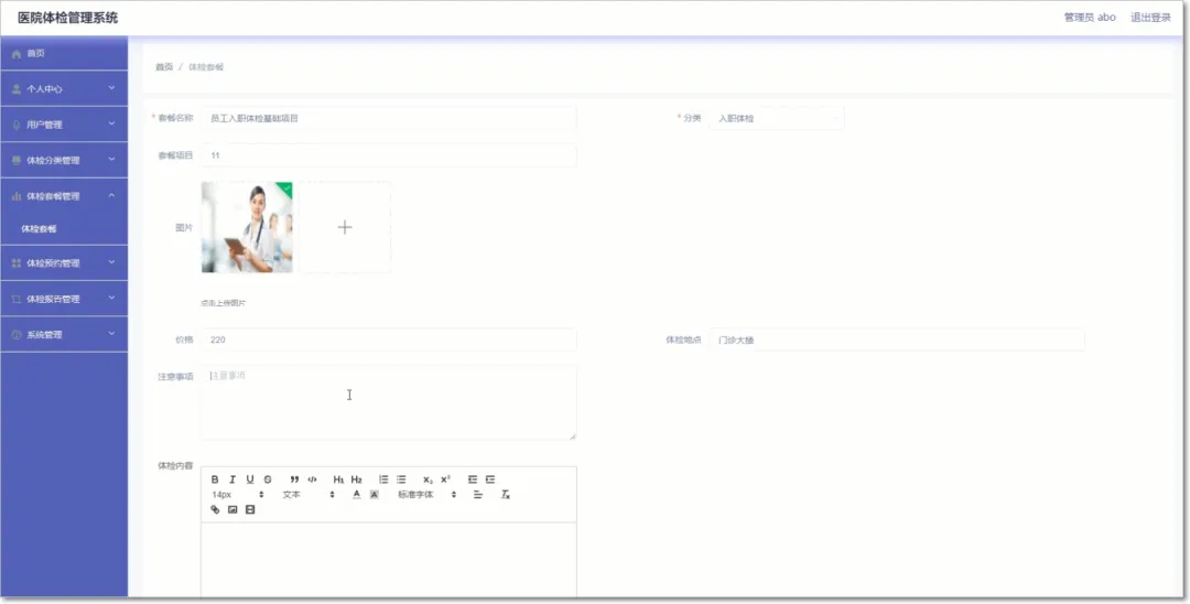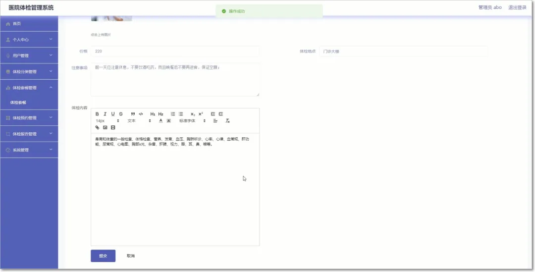 (1)体检套餐信息管理功能,对体检套餐进行上传、删除、编辑;