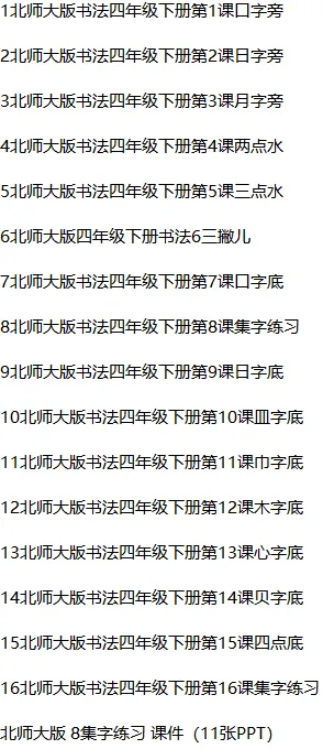 【电子版】2026春北师大版小学四年级书法指导下册 教案+课件(全套下载)可打印 下载原文请拉到文末 下载原文请拉到文末 01 资料目录 下拉到文章底部有二维码的地方下载 02 部分课件展示 版面有限 仅展示部分内容 03 部分教案展示 版面有限 仅展示部分内容 下载方法 长按二维轻松下载 电脑下载,方便保存 复制网址去电脑打开: https://jazpan.com/view/2441219 更多资源,关注以下公众号 教师·学生 图文来自网络,版权归原作者,如有不妥,告知即删 点击阅读原文下载1-12年级全部资
