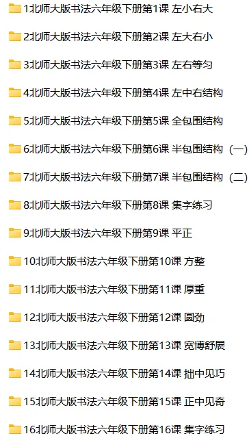 【电子版】2026春北师大版小学六年级书法指导下册 教案+课件(全套下载)可打印 下载原文请拉到文末 下载原文请拉到文末 01 资料目录 下拉到文章底部有二维码的地方下载 02 部分课件展示 版面有限 仅展示部分内容 03 部分教案展示 版面有限 仅展示部分内容 下载方法 长按二维轻松下载 电脑下载,方便保存 复制网址去电脑打开: https://jazpan.com/view/2441289 更多资源,关注以下公众号 教师·学生 图文来自网络,版权归原作者,如有不妥,告知即删 点击阅读原文下载1-12年级全部资
