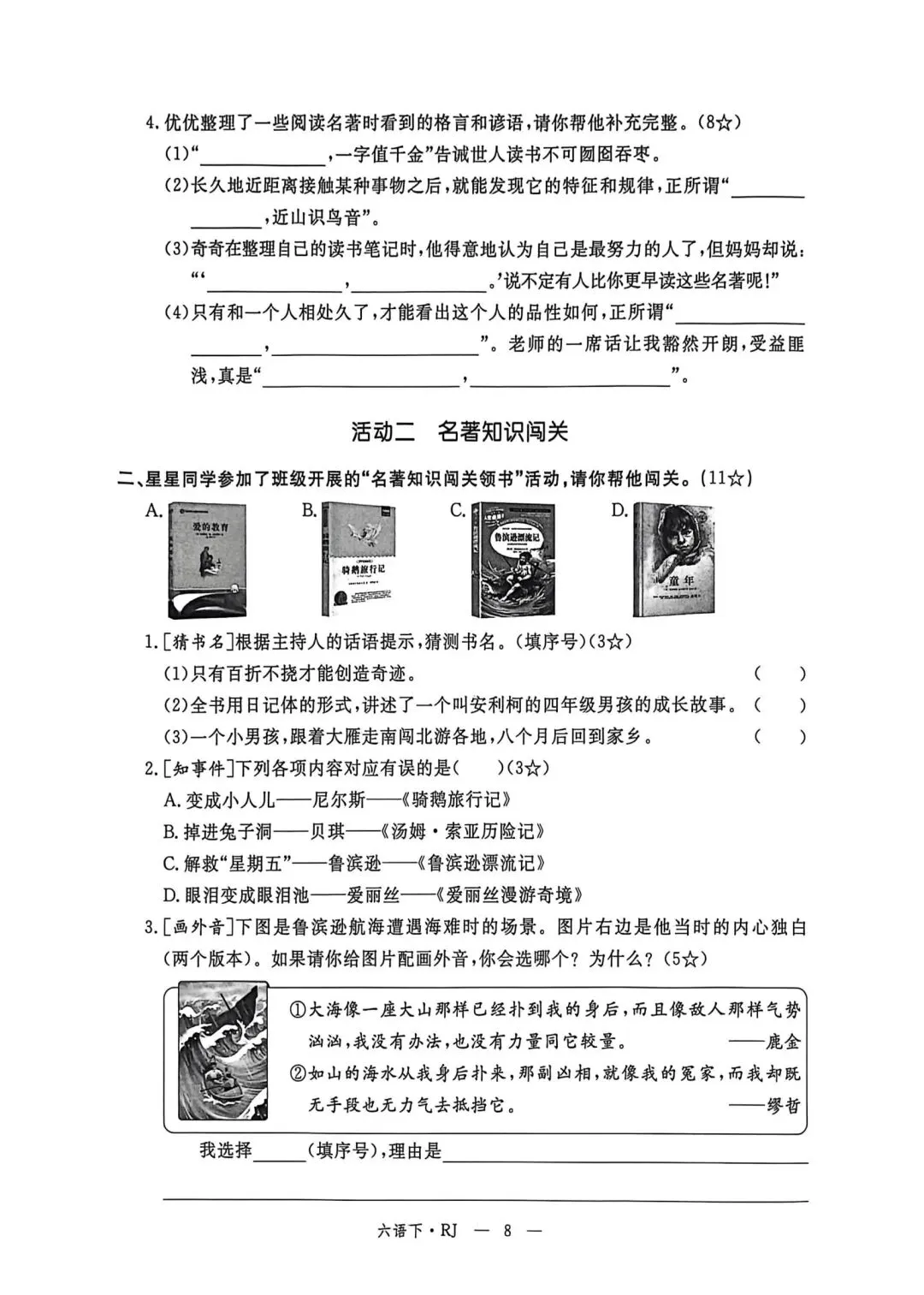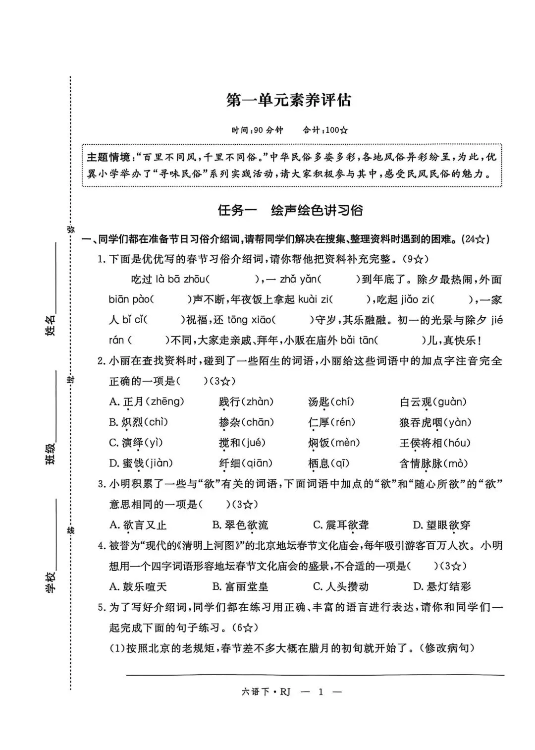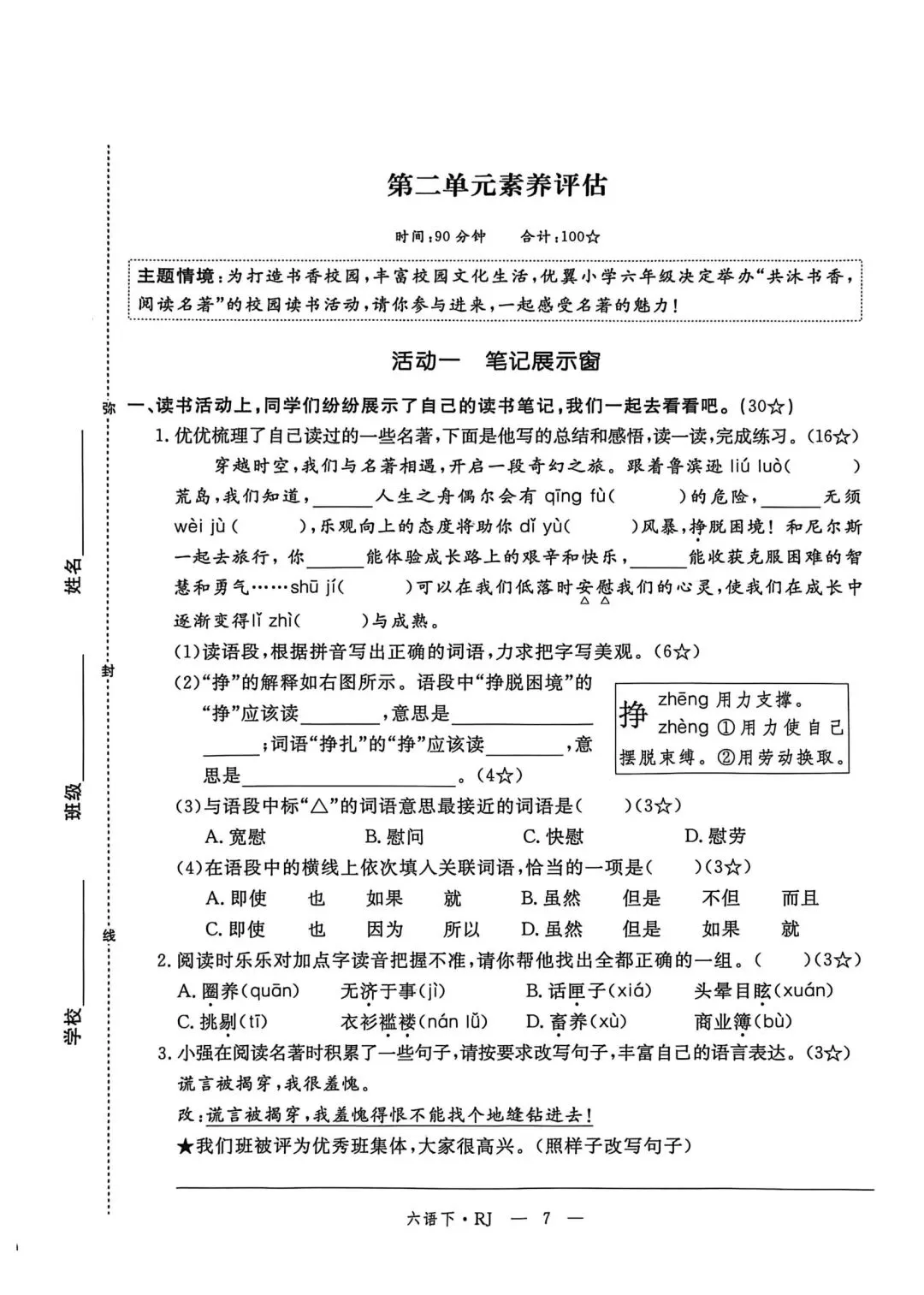 六年级下册语文素质评估卷含答案可打印