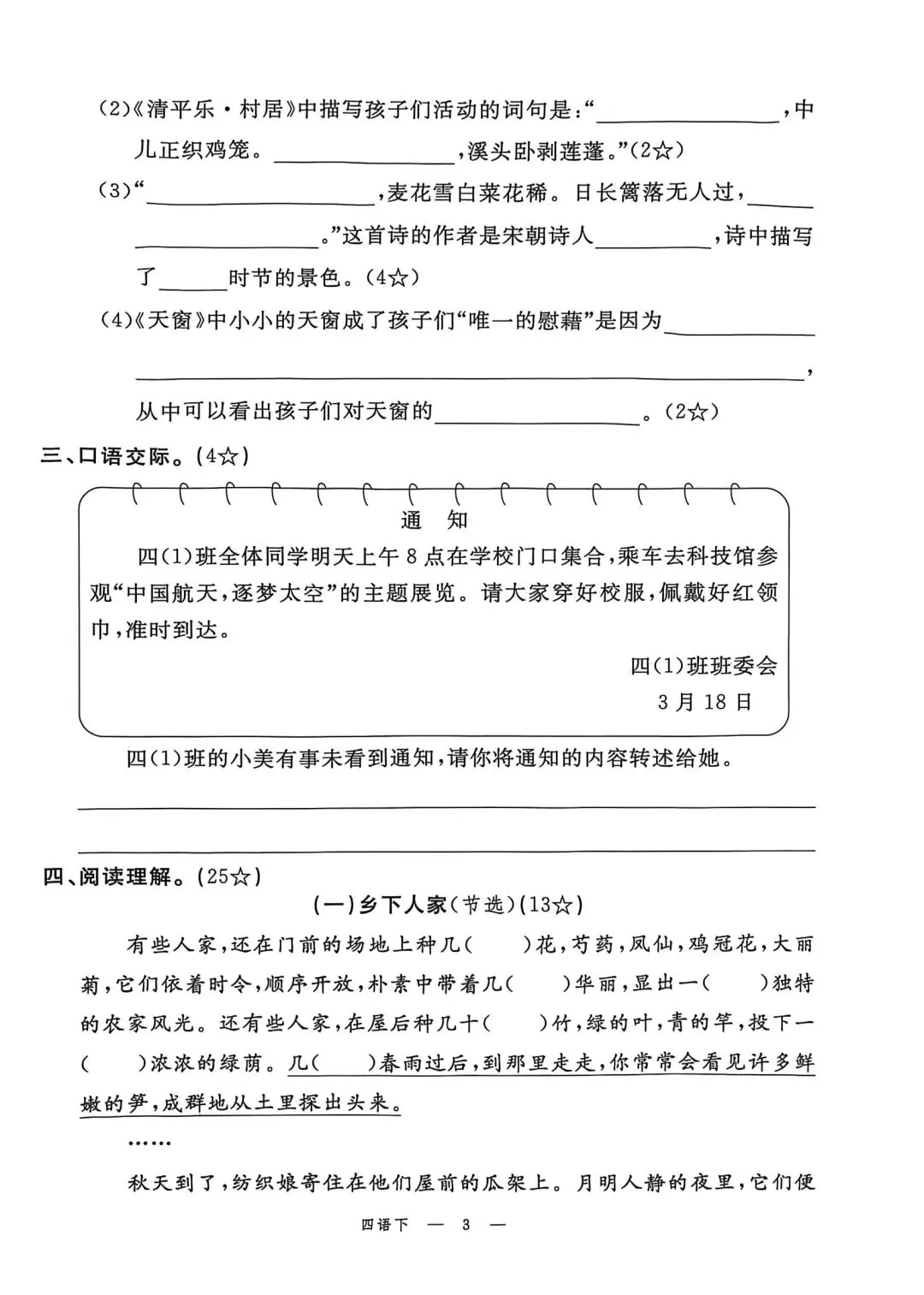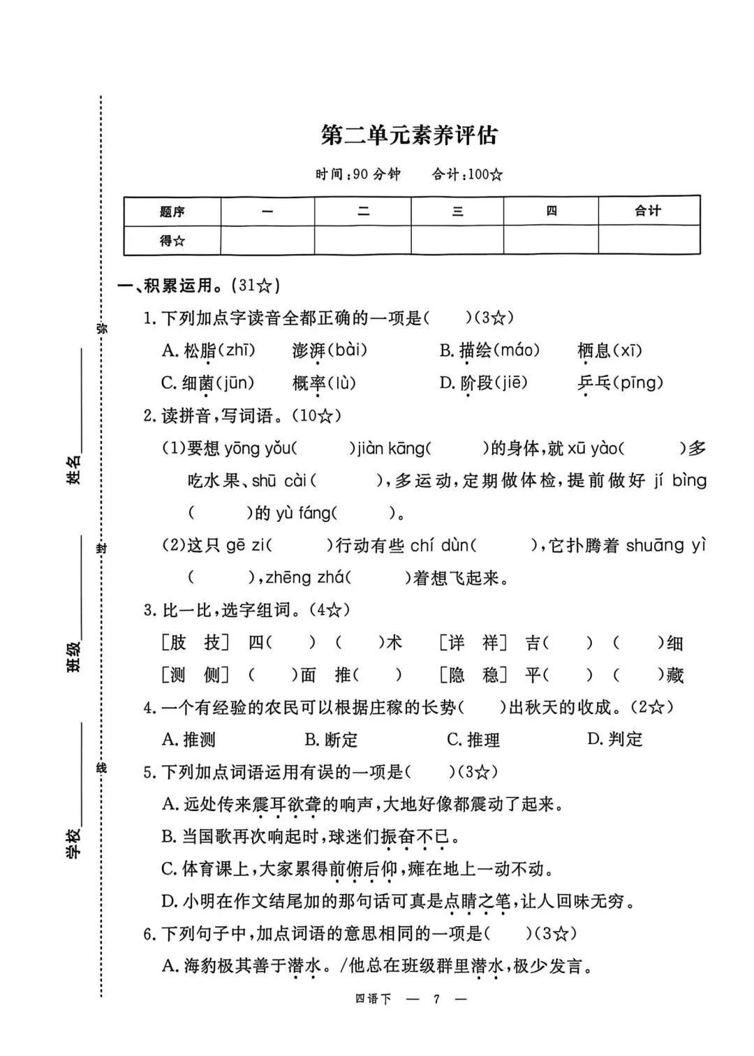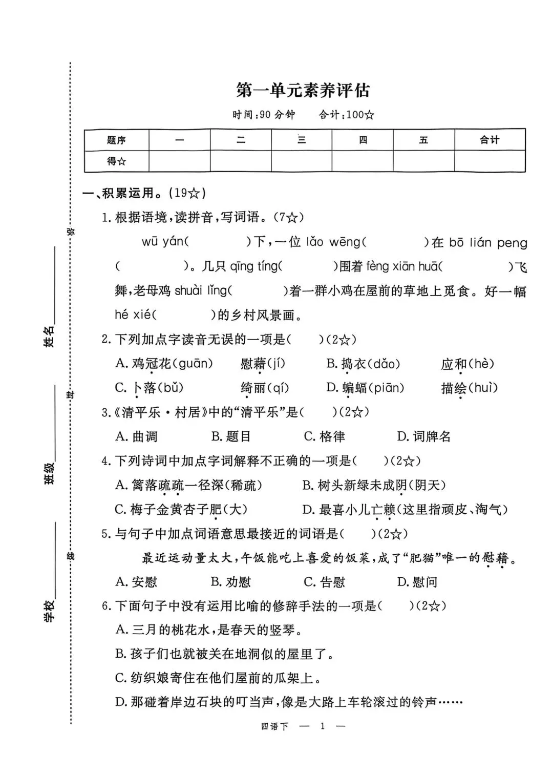 四年级下册语文素质评估卷含答案可打印