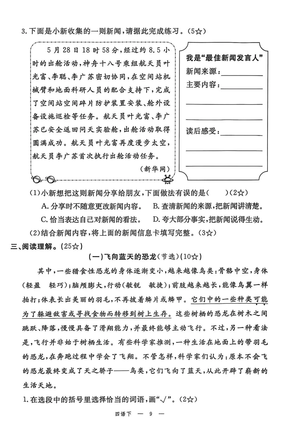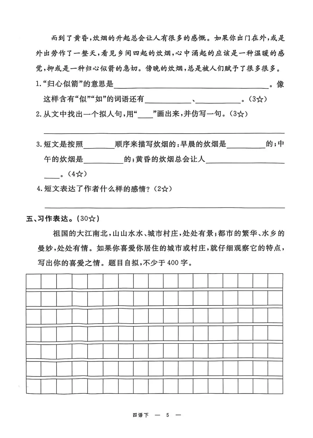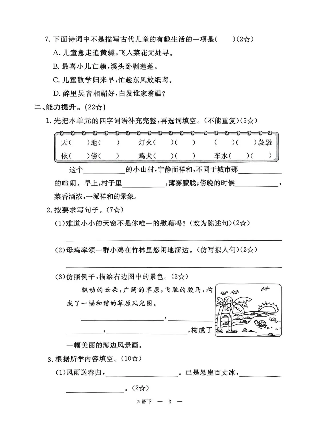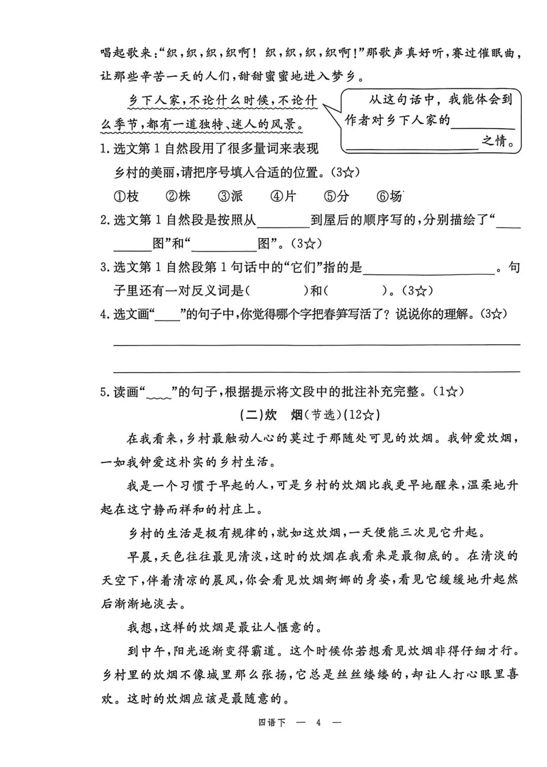 四年级下册语文素质评估卷含答案可打印