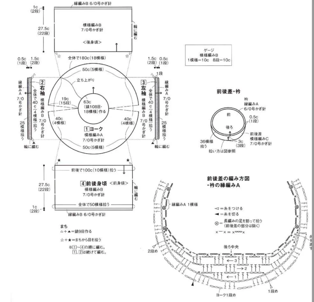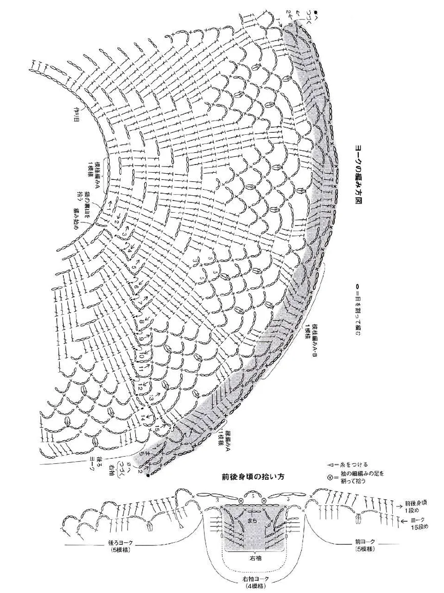 育克:将锁针起的起针成环,按照图解用花样A编织。接着编织右袖的裆部锁针9针。