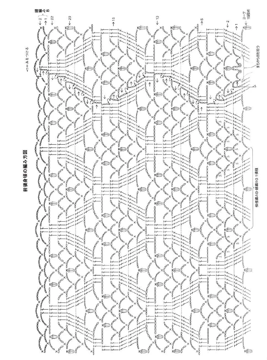 前后身片:从育克和裆部挑针,在后领口处用花样B圈织。接着编织边缘编织B。