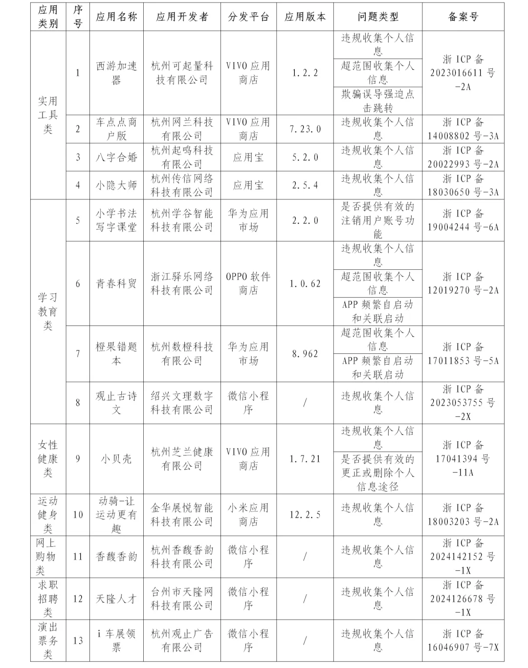 浙江省通信管理局通报存在问题的APP(小程序)名单