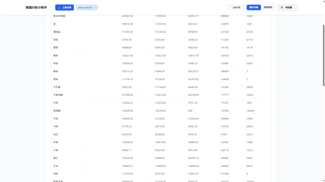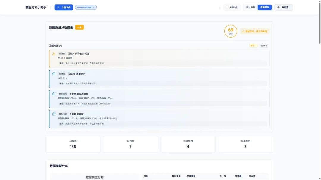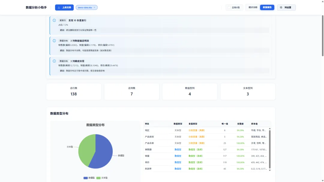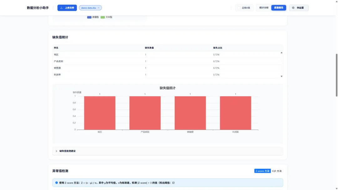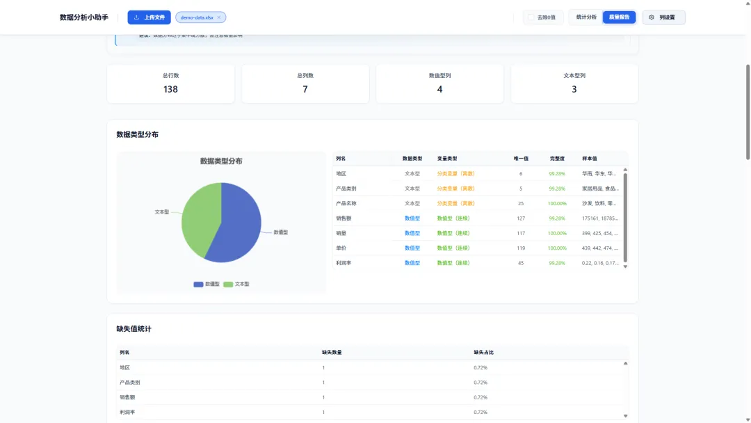 对于严谨的数据分析来说,“垃圾进,垃圾出”是铁律。data-analysis的另一大杀手锏是其数据质量分析模式。一键切换,即可获得一份详尽的数据健康报告: