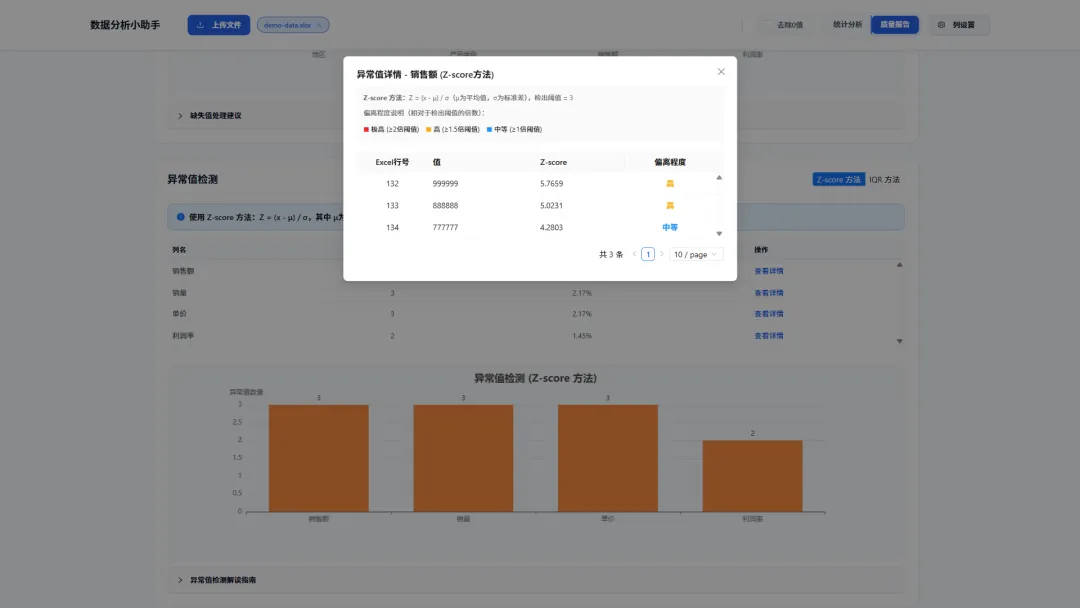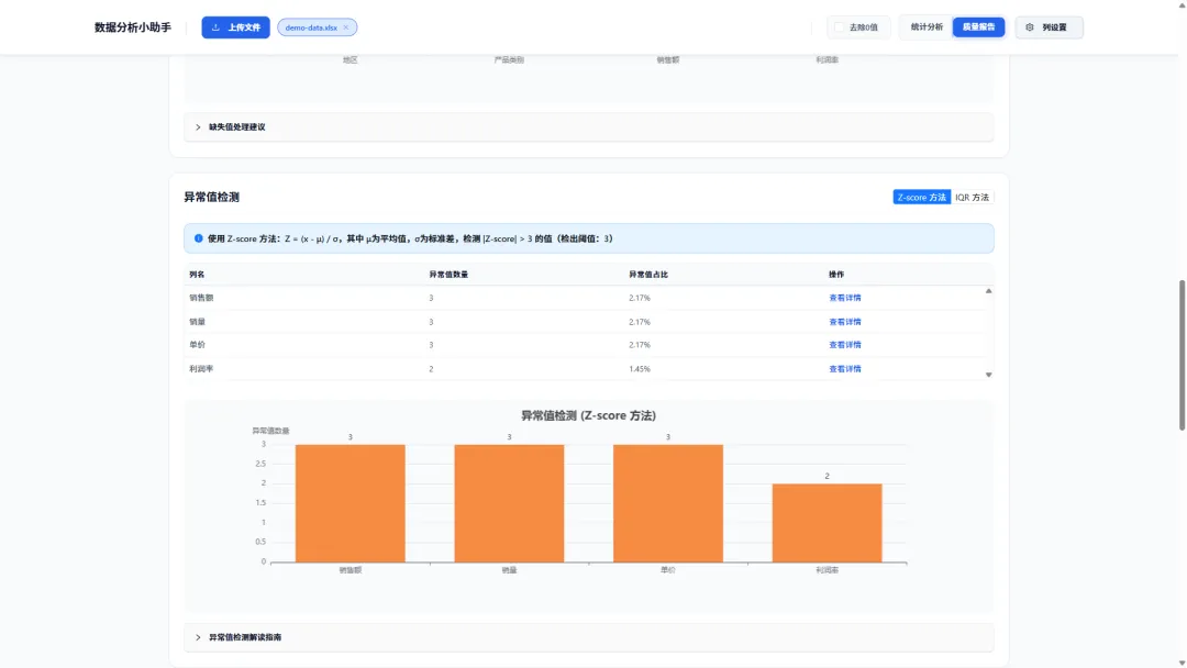 异常值检测:同时支持Z-score(适用于近似正态分布的数据)和IQR(更稳健,适用于任意分布)两种业界标准方法,帮你揪出那些“不合群”的数据点。