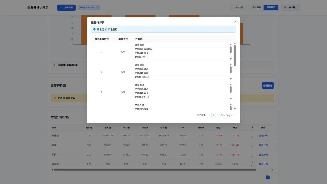 重复行检测:快速扫描并高亮显示完全重复的记录,避免因数据冗余导致的分析偏差。