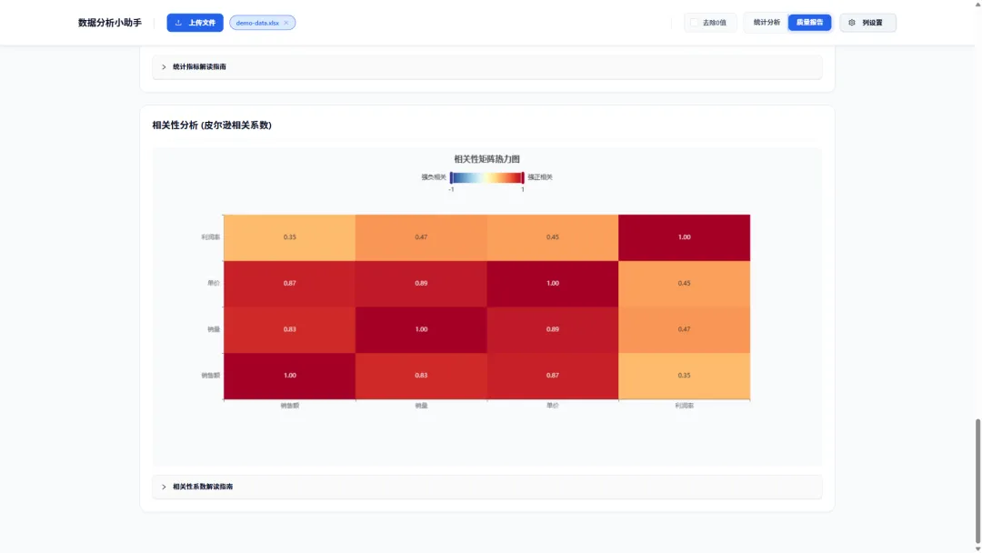 相关性分析:自动计算数值型列之间的皮尔逊相关系数,并以热力图形式展示,帮助你发现变量间的潜在关系。