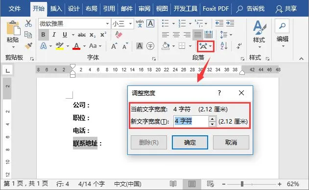 (1)首先选择最多字符的文本,这里选择“联系地址”文本,点击【开始】-【段落】-【中文版式】-【调整宽度】按钮,在打开的对话框中查看到“当前文字宽度:4字符(2.12厘米)”。