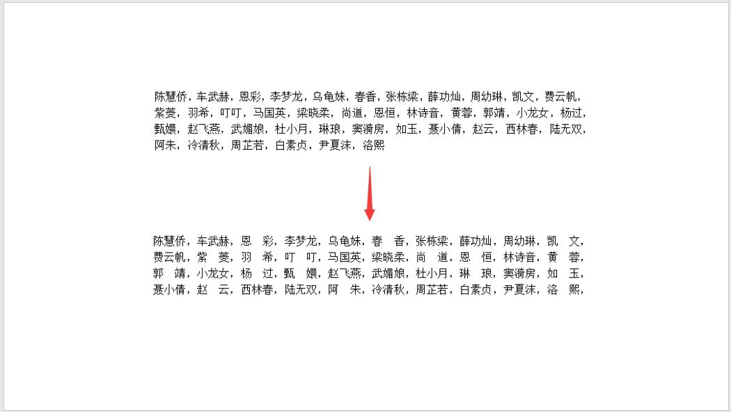 例如:下图中有许多人名,由于它们的字符个数不相同,这样看起来有点杂乱,如果能够对齐所有姓名的话,就会整洁很多。那么,如何将它们快速对齐呢?这时可以利用查找替换+调整宽度功能快速对齐它们。