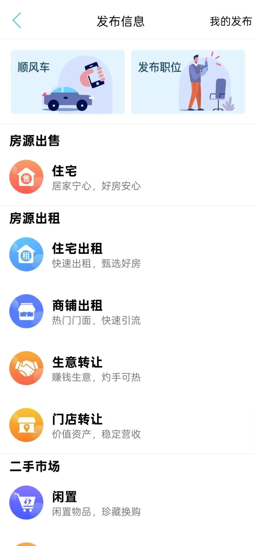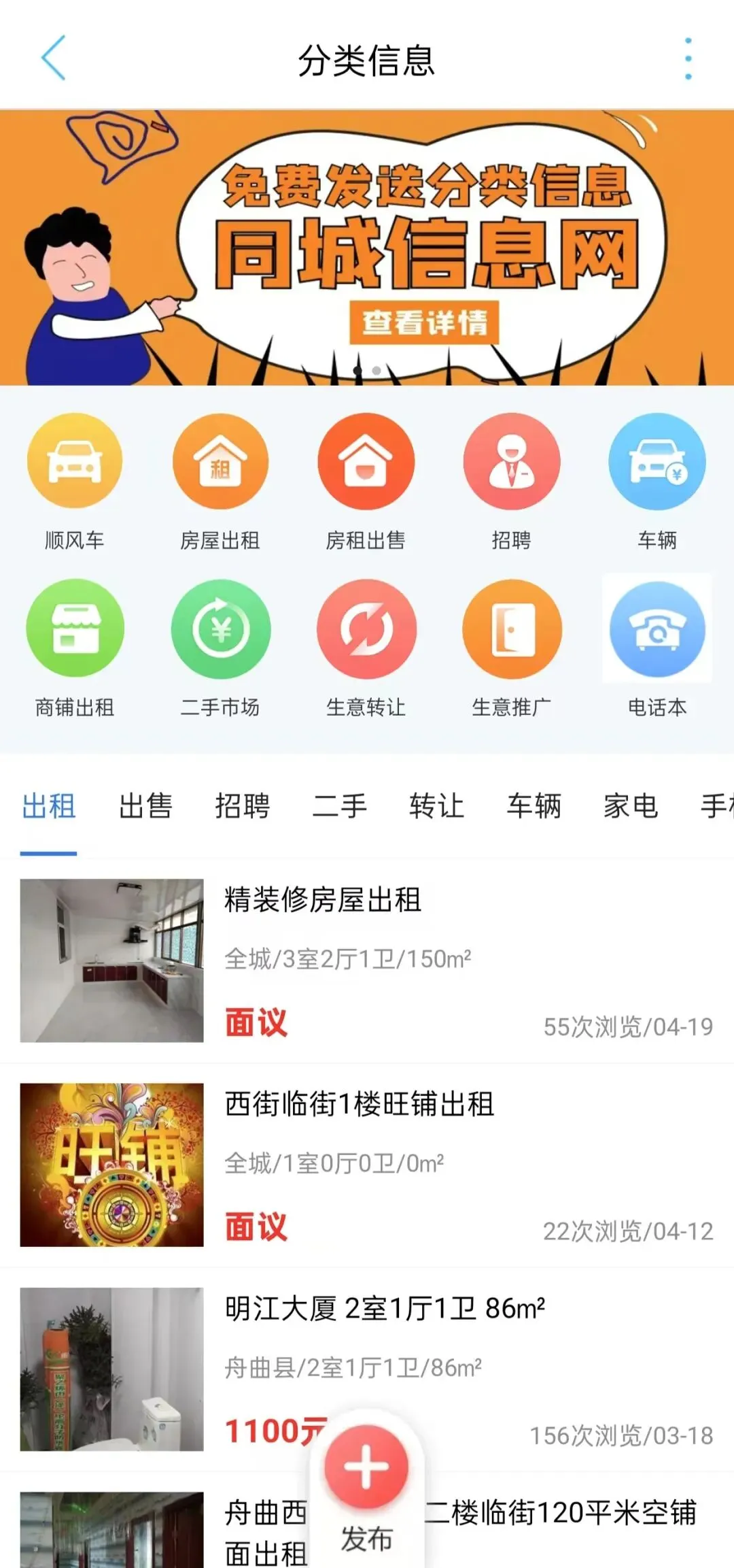 作为专为本地居民打造的信息平台,这里覆盖生活全场景:房屋租售、招聘求职、二手置换、旺铺转让、家政服务、同城跑腿、美食外卖,你想找的信息这里都有。发布流程超简单,无需注册登录,填写信息、上传图片,一键就能发布,几分钟内就能触达同城用户,发布信息零成本、无门槛,几步操作就能上线 。