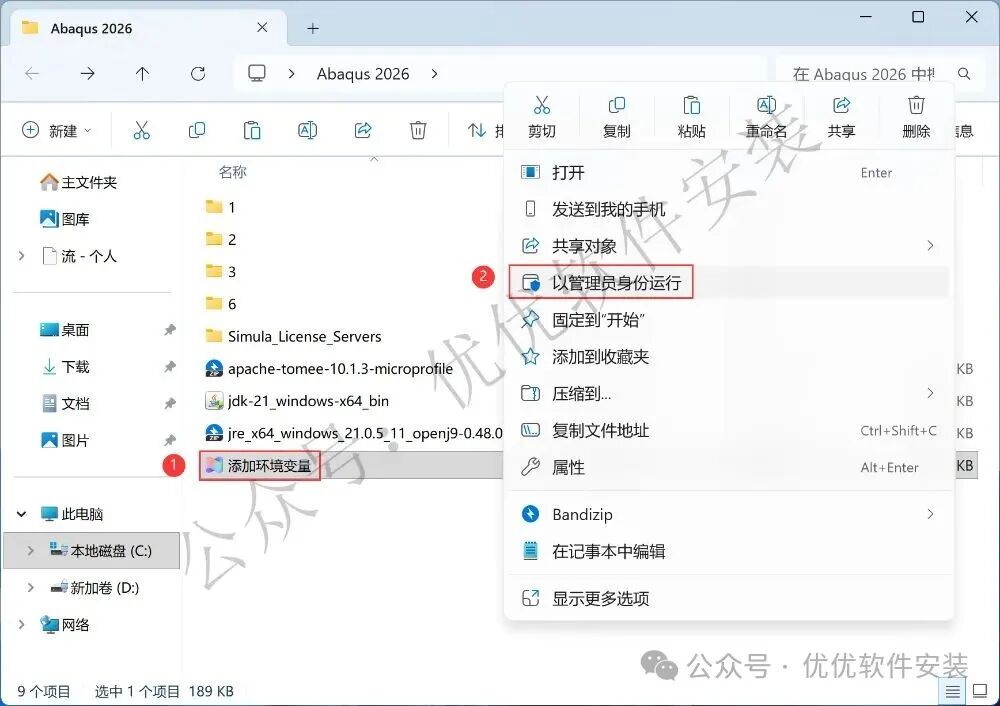 8、回到Abaqus 2026文件夹,找到【添加环境变量】应用程序,右键选择【以管理员身份运行】它