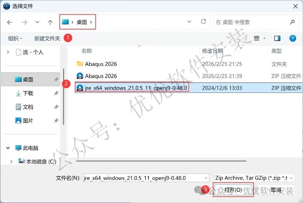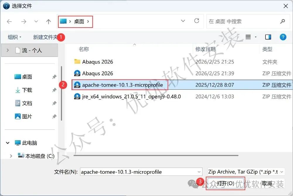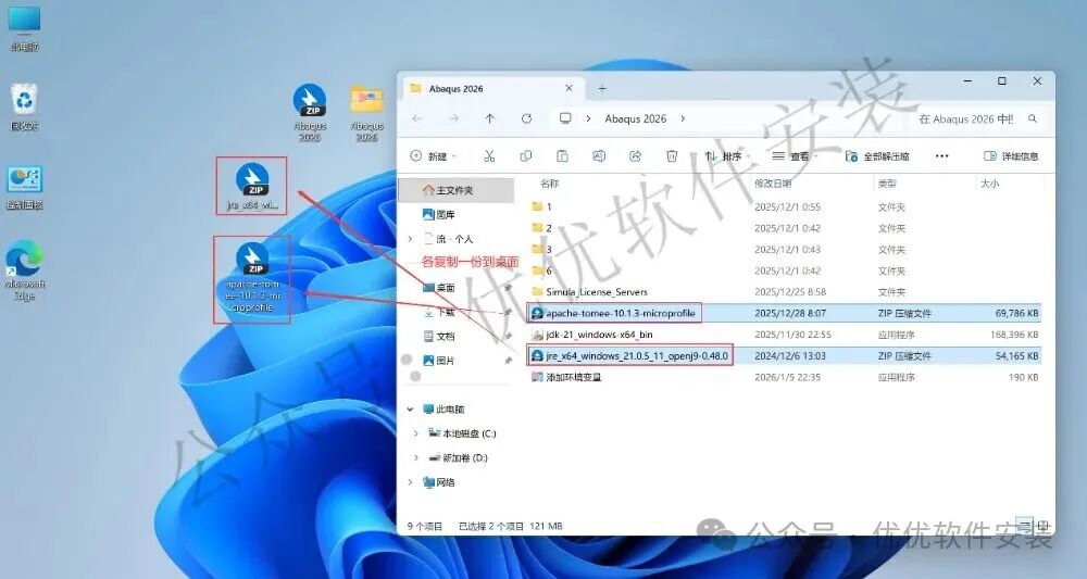 42、回到Abaqus 2026文件夹,将【jre_x64…】和【apache-tomee…】两个压缩包文件复制到桌面