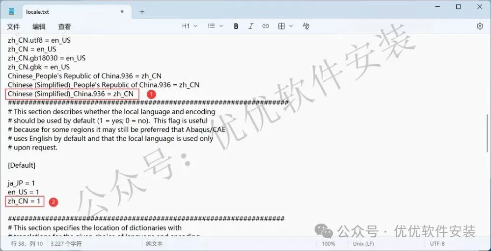 56、在[Chinese(Simplified)…]下一行添加:Chinese (Simplified)_China.936 = zh_CN,再将zh_CN =后的0改为1