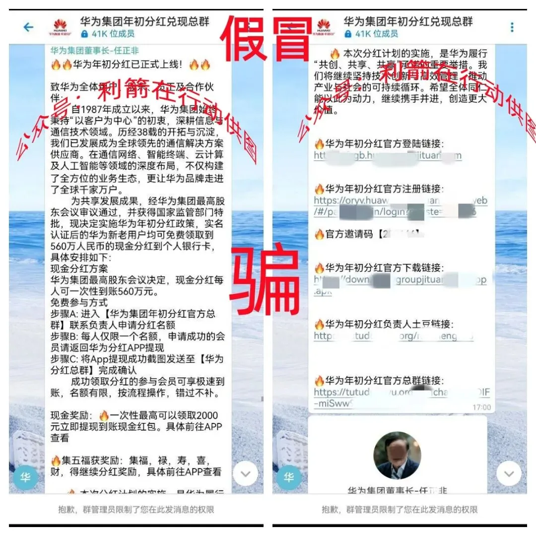 这几天网络中出现了假冒华为公司的“年初分红”APP,查到“华为年初分红”网站搭建在境外,系非法网站!网站网址不是华为公司的,系假冒!该项目宣传“实名认证注册就能获得华为分红560万元………..”,这一眼假的骗局,让不少人趋之若鹜去注册,呼朋唤友拉人注册,群里面假冒的华为高管是骗子伪装的,华为公司高管都很忙,哪有时间在群里面一天到晚不做事与大家瞎掰?