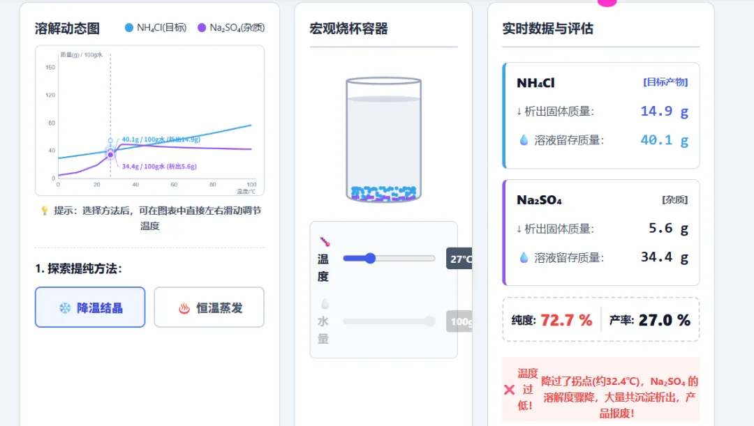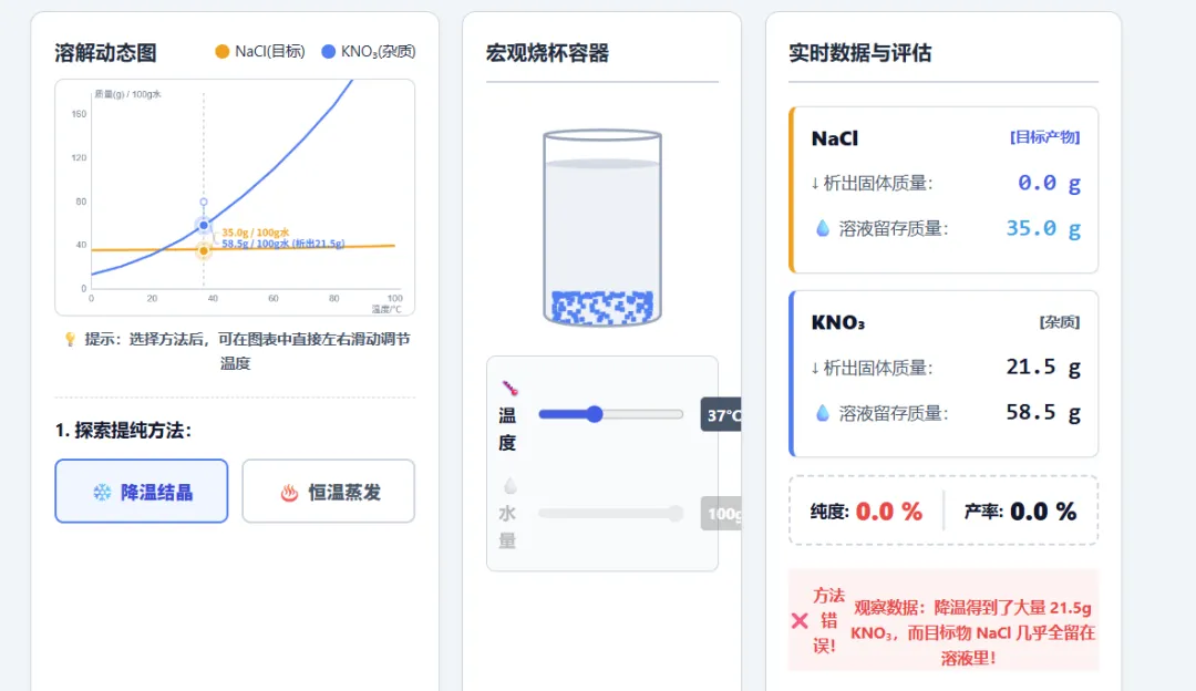 右侧的烧杯立马给他表演一个“杂质大爆发”,目标产物氯化钠几乎全留在水里,而硝酸钾疯狂析出!同时,右侧面板的纯度当场爆红报警!