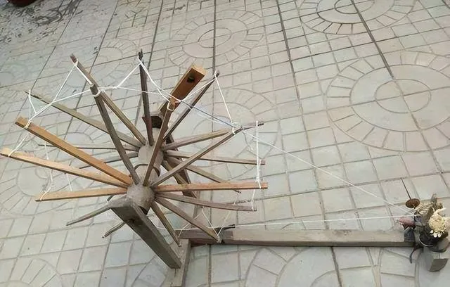 图中这一大家伙叫手摇纺车,原木色,几根长短不一的木轴交错咬合,一圈又一圈的线,转起来时“吱呀吱呀”响,半夜醒来,屋里亮着油灯,就是母亲在这纺线的背影,冬天棉花堆一屋,纺一晚上出来的是家里一年的新被套。