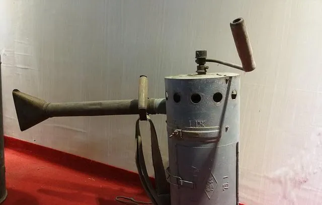 图里这个金属圆筒,扛在肩头晃悠悠走田间的,那就是老式喷粉器,用于喷洒粉剂农药,手摇一转,前面那把风嘴就往庄稼叶子上吹,五十岁以上的,肯定认得出来。