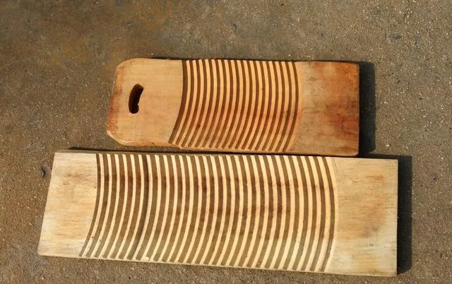 这个横七竖八的木板叫搓衣板,大人们常常把衣服一摊,撒上肥皂水,两只手快慢各有节奏,“哐哐”敲两下浮土就跑出来了,凹槽打磨得又深又顺,搓衣服的时候水花溅一身。