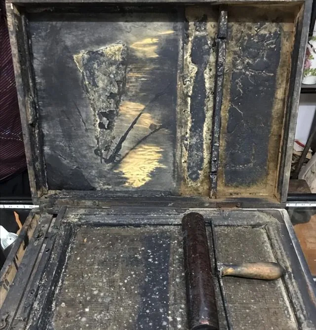 图上一大一小,这一组东西就是油印机和蜡纸,老式学校印卷子的主力军,铁皮壳一开墨黏糊糊,两只滚轴咕噜一转,试卷、通知单都靠手摇印出来,老师一边刻蜡纸一边喊人帮着摇,有时墨太浓纸还沾花,一身都是黑指印。