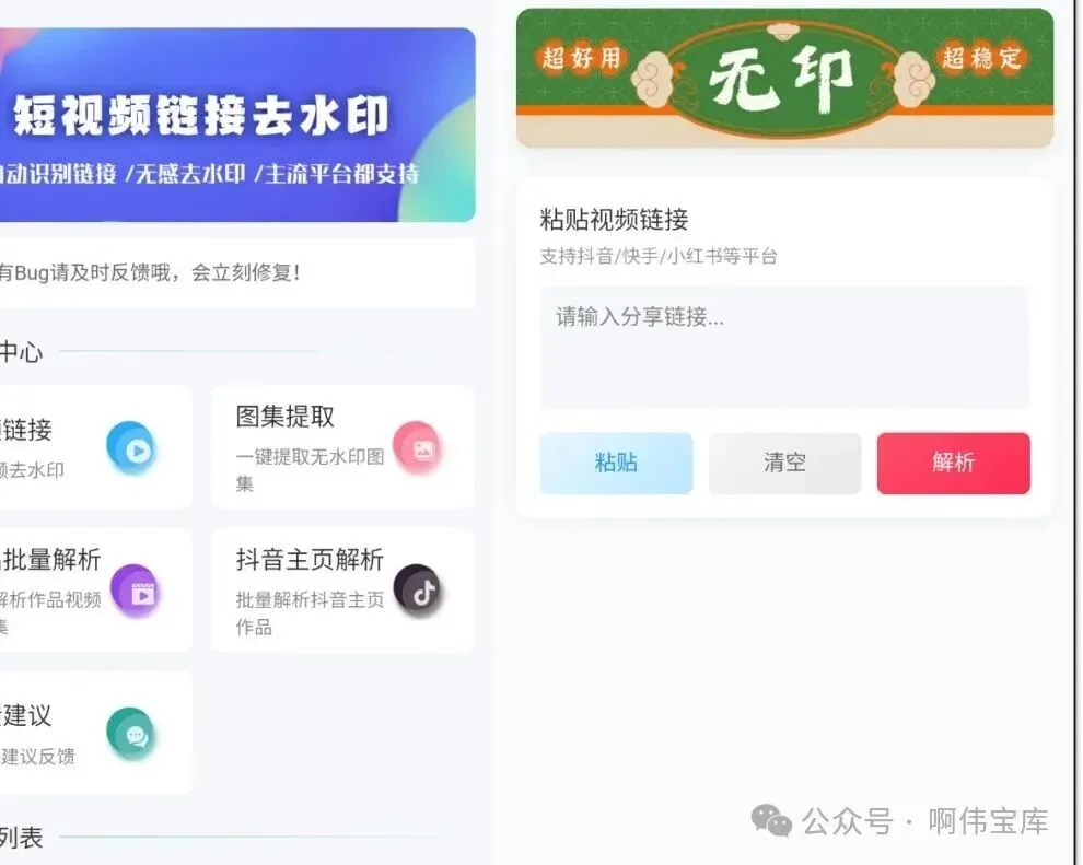 能力范围:可提视频,标题,缩略图,图集和去视频水印。