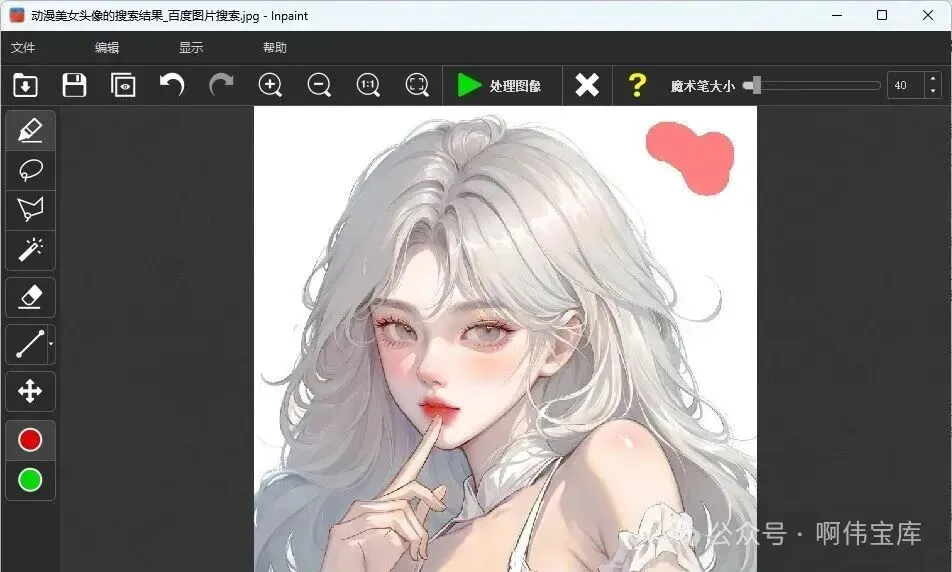使用方法:打开inpaint,将需要去除水印的图片拖入软件中,将需要去除的地方涂抹一下,点击处理就能去除。