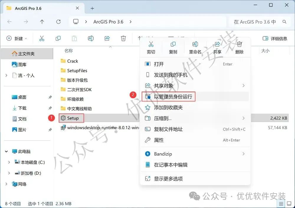 7、回到ArcGIS Pro 3.6文件夹,找到【Setup】应用程序,右键选择【以管理员身份运行】它
