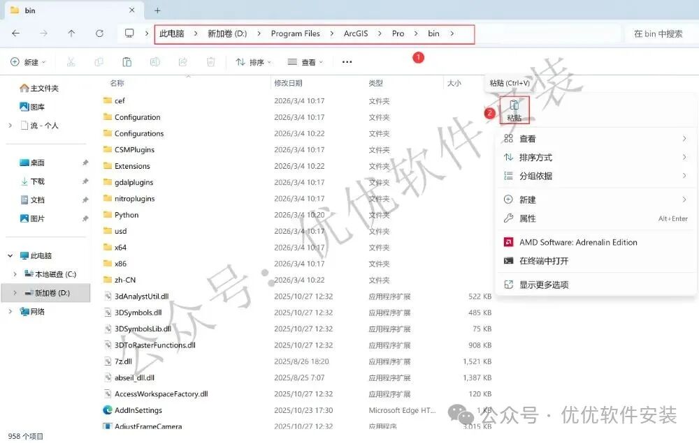 29、打开路径:D:\Program Files\ArcGIS\Pro\bin,再右键文件夹的空白处,点击【粘贴按钮】